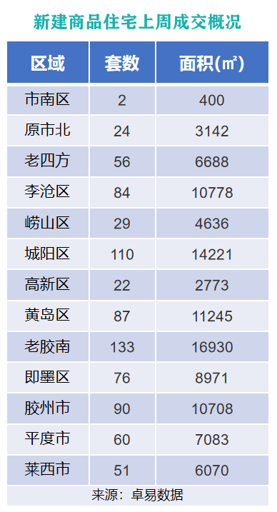 从各区成交情况来看,上周原胶南市新建商品住宅以成交面积16930㎡的成绩,位列上周各片区新建商品住宅成交面积榜首位;城阳区以成交面积14221㎡的成绩,位列成交面积榜第二位;原黄岛区以成交面积11245㎡的成绩,位列成交面积榜第三位。