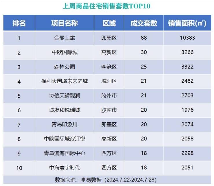 从各项目成交套数来看,位于即墨区的金丽上寓以成交88套的成绩列榜单首位;位于高新区的中欧国际城以成交30套成绩上榜第二位;位于李沧区的森林公园以成交25套的成绩列榜单第三位。