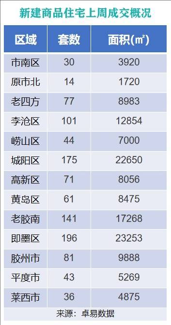 从各区成交情况来看,上周即墨区新建商品住宅以成交面积23253㎡的成绩,位列上周各片区新建商品住宅成交面积榜首位;城阳区以成交面积22650㎡的成绩,位列成交面积榜第二位;原胶南市以成交面积17268㎡的成绩,位列成交面积榜第三位。