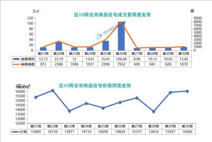 价格方面,上周青岛新建商品住宅均价为16066元/㎡,上涨139元,涨幅为0.87%。
