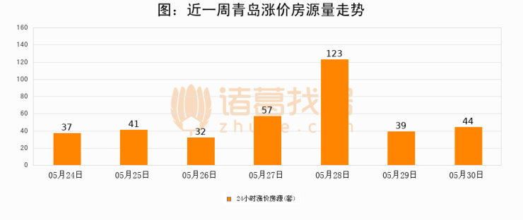 根据诸葛找房数据显示,青岛24小时涨价房源量为44套,较05月29日增加5套,环比上涨12.8%。与此同时,涨价房源占比小幅扩大,业主信心有所提升。