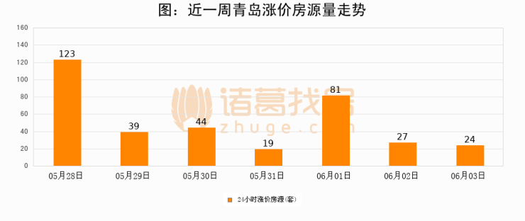 根据诸葛找房数据显示,青岛24小时涨价房源量为24套,较06月02日减少3套,环比下降11.1%。与此同时,涨价房源占比小幅回落,对于购房者来说是一个入市窗口期,购房者可抓住时机入市。