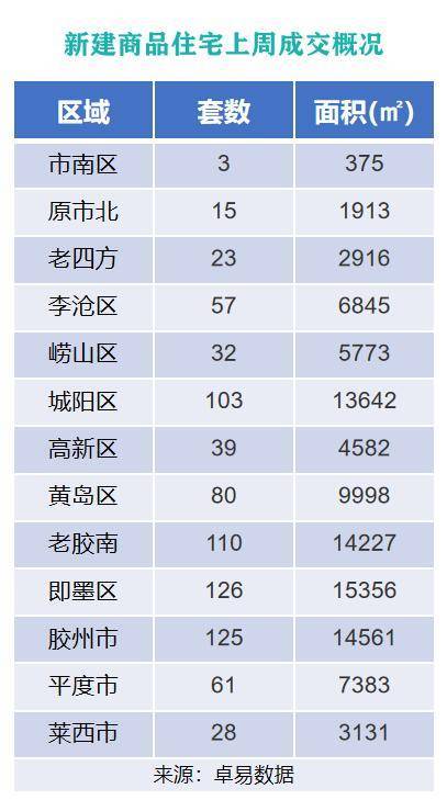 从各区成交情况来看,上周即墨区新建商品住宅以成交126套,成交面积15356㎡的成绩,位列上周各片区新建商品住宅成交面积和成交套数榜首位;胶州市以成交125套,成交面积14561㎡的成绩,位列成交面积榜第二位;原胶南市以成交110套,成交面积14227㎡的成绩,排成交面积榜第三位。