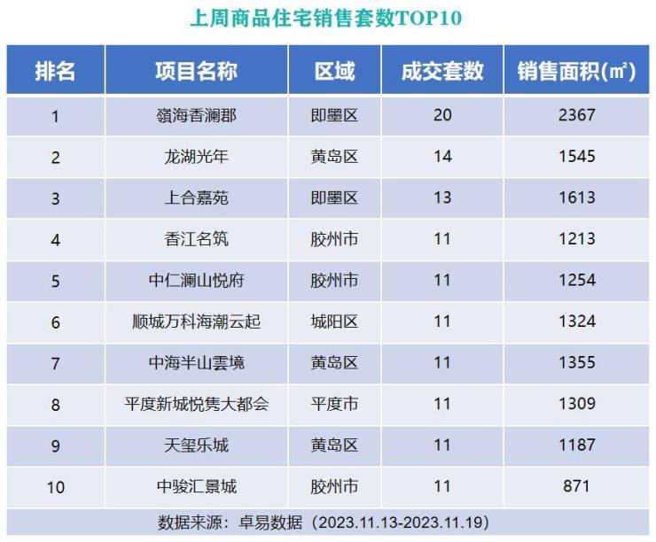 从各项目成交套数来看,位于即墨区的嶺海香澜郡以成交20套的成绩列榜单首位;位于西海岸新区的龙湖光年以成交14套成绩上榜第二位;位于即墨区的上合嘉苑以成交13套的成绩列榜单第三位。