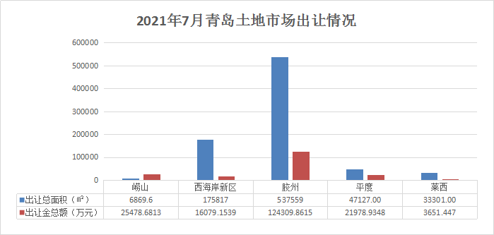 从各区的出让情况来看,胶州市成为青岛7月的土拍大户,共计出让13宗地块,土地面积537559㎡,占比本月土拍面积的近七成,上榜7月榜首;西海岸新区虽只出让有2宗地块,但土地面积榜单上榜第二,土地面积达175817㎡;平度市成功出让1宗地块,土地面积47127.00㎡,位列第三;其次是莱西市,成功出让1宗地块,土地面积33301.00㎡;最后是崂山区,出让1宗地块,土地面积6869.6㎡。