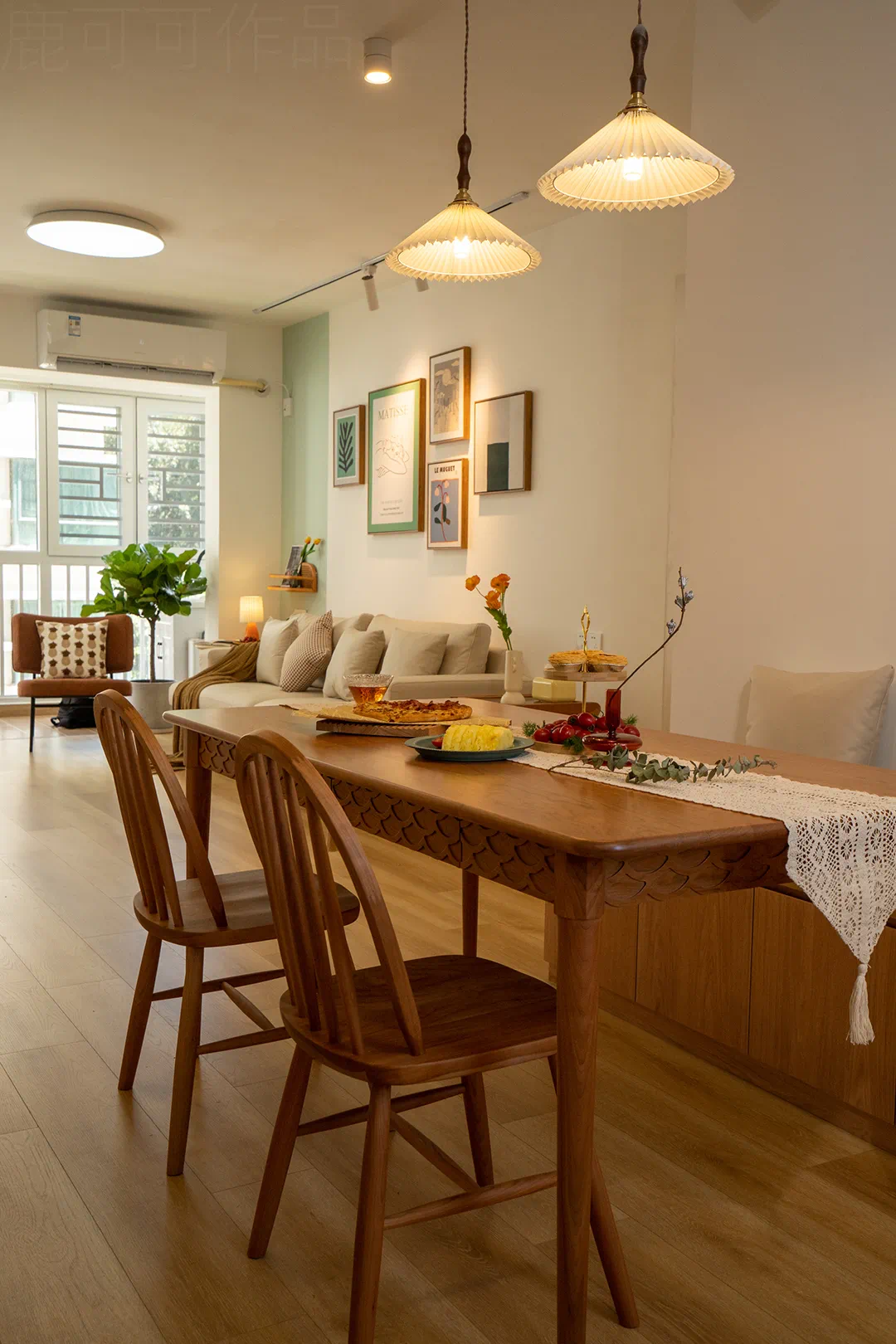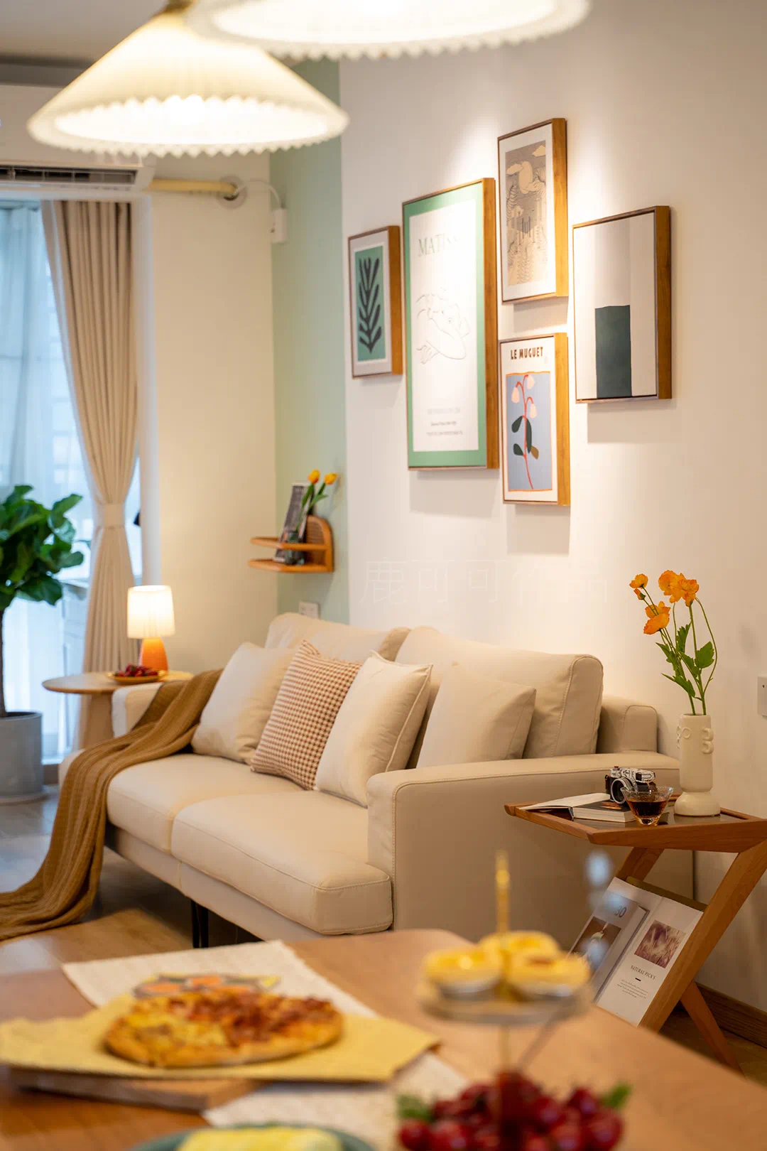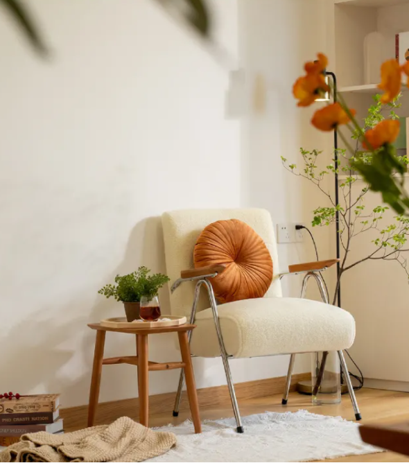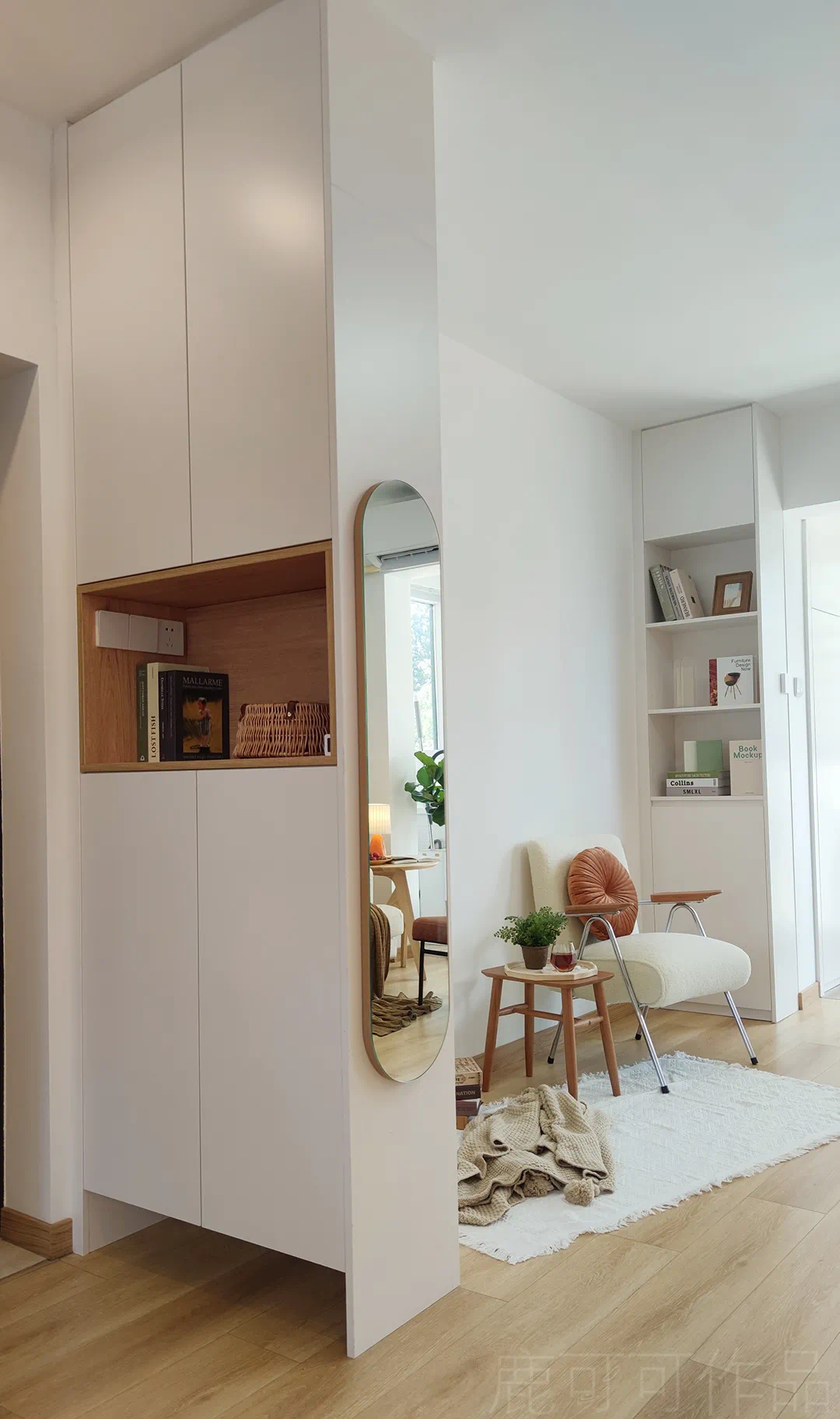 这面留大白的墙就是每个节日的背景墙,随心布置~也是客厅的阅读角,旁边的收纳柜留了开放的书柜,放置常阅的书本。
