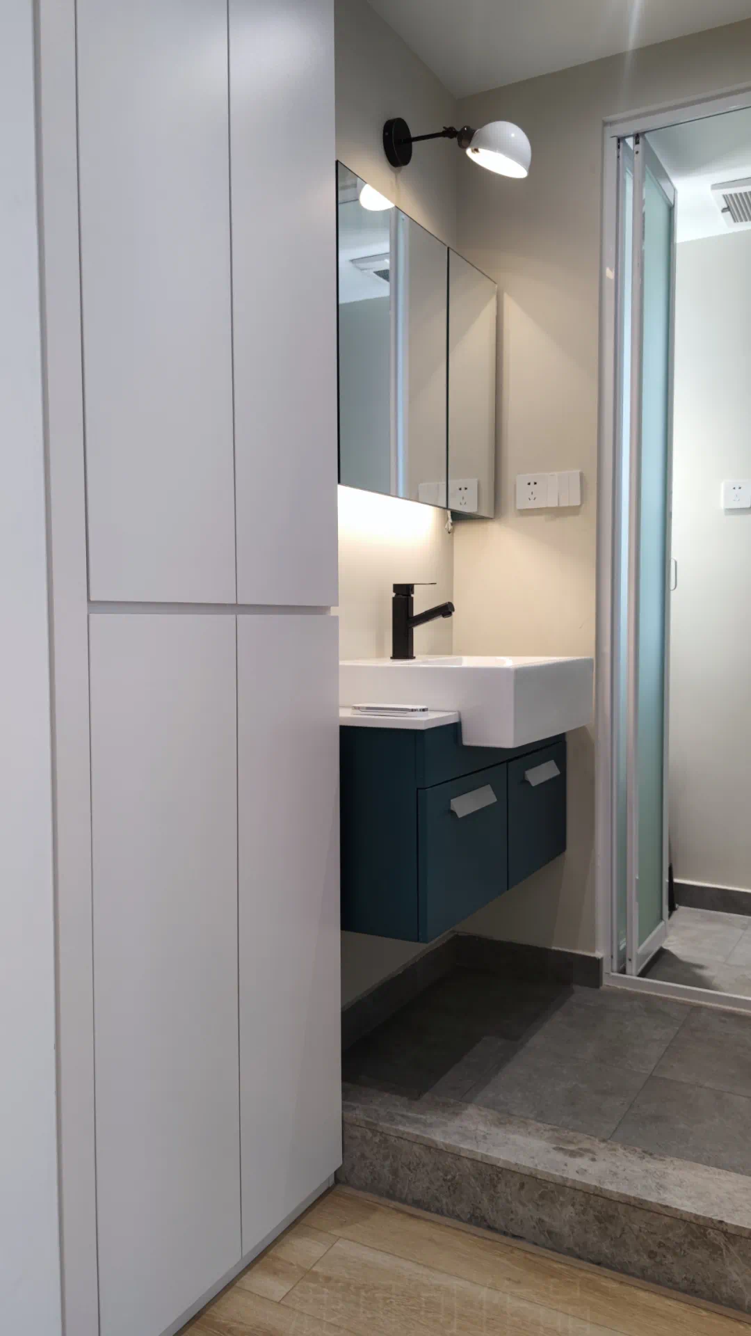 卫生间做了三分离,干区收纳柜的功能很强,马桶区与淋浴区以玻璃隔断进行分区。