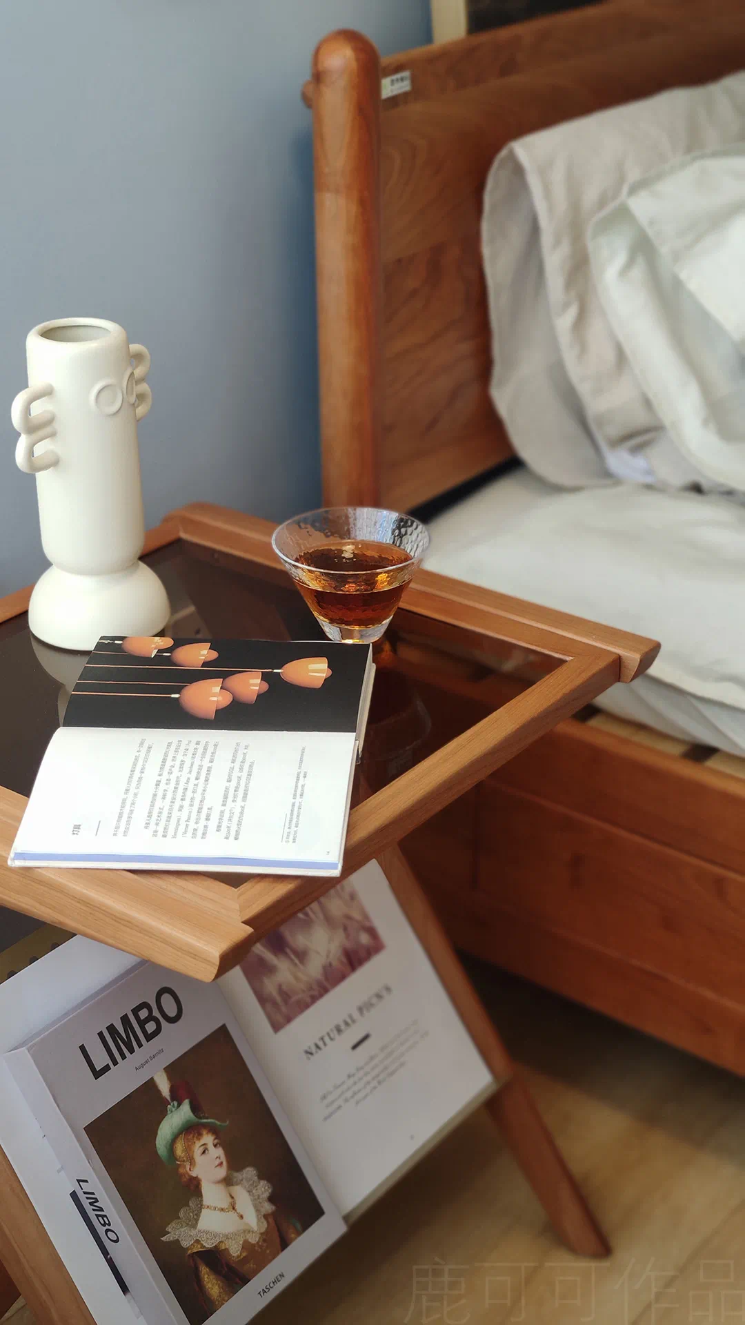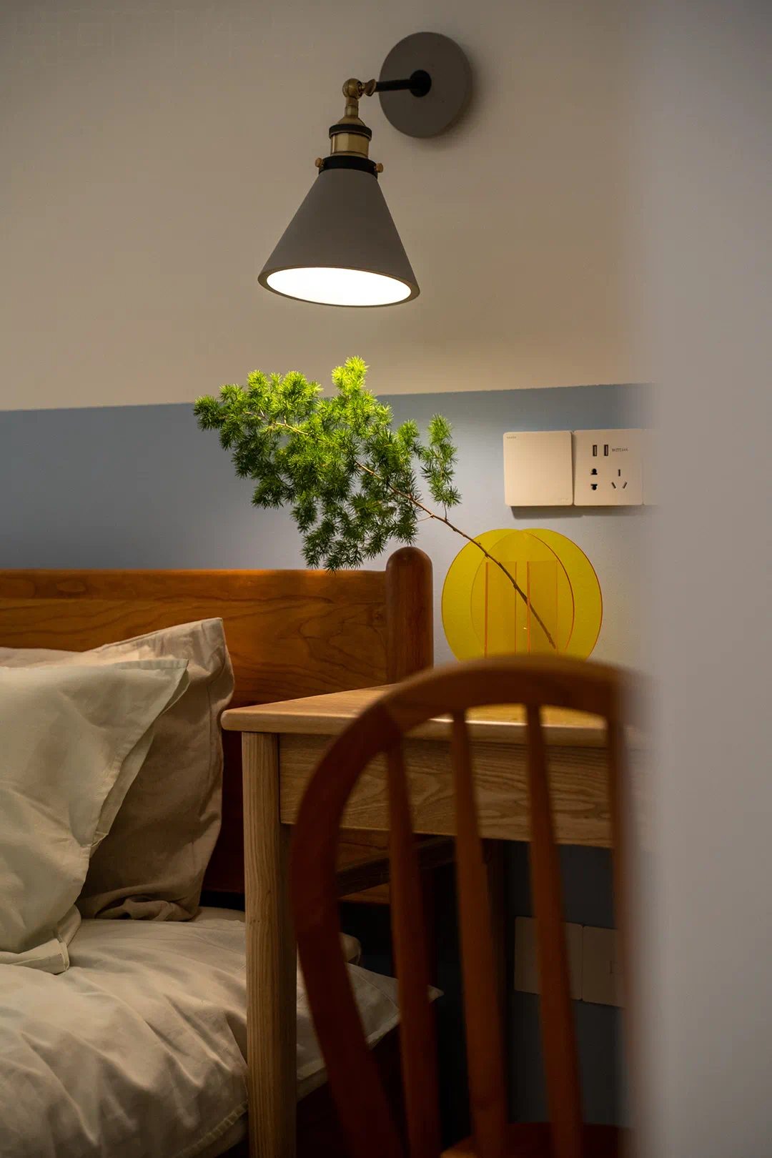 清爽混搭复古调调的卧室,背景是用莫兰迪甘蓝色做了半墙分色设计,樱桃木的家具与背景墙的撞色使空间的氛围变的很特别,温柔中夹杂着一丝冷静。