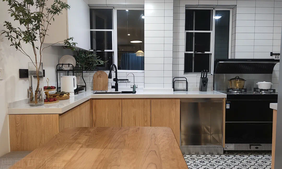 开放式厨房,有两个窗,白天采光很好,加上厨房白色的墙砖,整个空间很通透明亮,改造时充分利用了空间,做成了G字型的厨房。