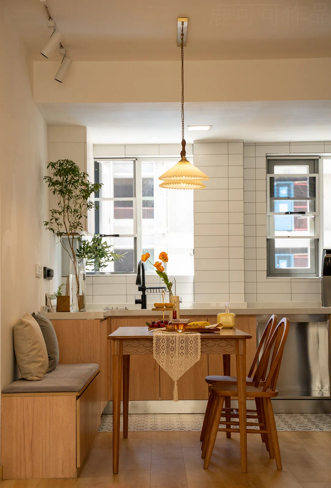 餐厅定做了卡座,地柜可增加收纳,固定的坐位不需要给餐椅留位置,更省空间,日常可以满足六人用餐。