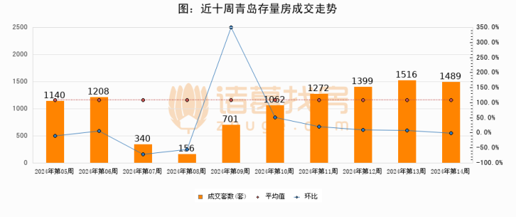 存量房方面,第13周青岛存量房成交1489套,较上周减少27套,环比下降1.8%。从近十周成交走势来看,周均成交套数为1028套,本周高于平均水平44.8%。