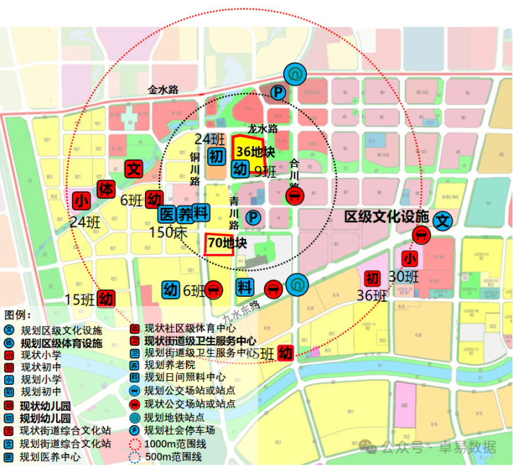 2.教育与医疗:现状周边有1处初中,2处小学,3处幼儿园;规划周边有1处初中,2处幼儿园,1处医养中心(包括1处养老院及1处二类日间照料中心),1处三类日间照料中心。