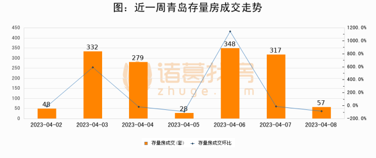 从存量房来看,2023年04月08日青岛存量房单日成交57套,比昨日减少260套,环比下降82%。从近一周存量房成交来看,青岛存量房日均成交套数为201套,04月08日单日成交57套,低于近一周平均水平71.6%。