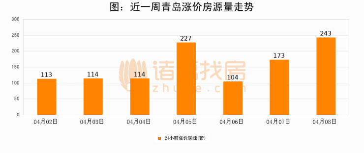 根据诸葛找房数据显示,青岛24小时涨价房源量为243套,较04月07日增加70套,环比上涨40.5%。与此同时,涨价房源占比小幅扩大,业主信心有所提升。
