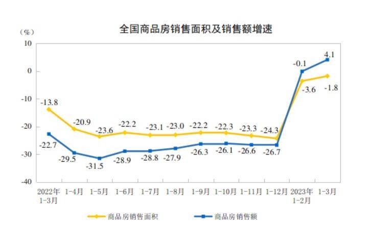 4月18日,国家统计局发布2023年1-3月份全国房地产市场基本情况,一季度在政策加持以及前期积压需求释放带动下,1-3月,全国商品房销售面积同比下降1.8%,较1-2月收窄1.8个百分点,延续收窄态势;商品房销售额同比增长4.1%,结束2022年以来月度累计同比连续下降的趋势。
