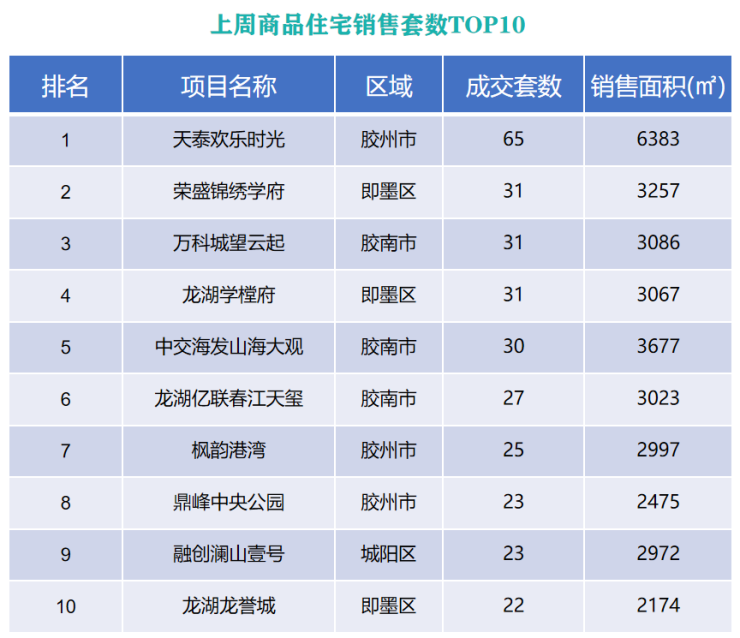 从各项目成交情况(成交套数)来看,位于胶州市的天泰欢乐时光以成交65套,销售面积6383㎡的成绩列榜单排名前列;位于即墨区的荣盛锦绣学府以成交31套,销售面积3257㎡的成绩上榜第二位;位于原胶南市的万科城望云起以成交31套,销售面积3086㎡的成绩列第三位。