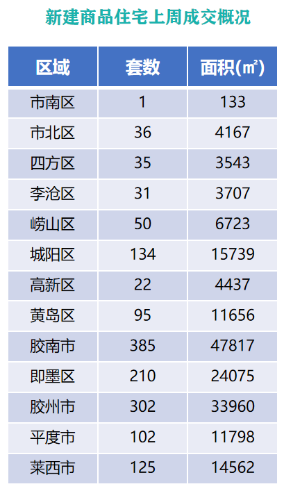 从各区成交情况来看,上周原胶南市新建商品住宅成交385套,成交面积为47817㎡,位列上周各片区新建商品住宅成交面积和成交套数的首位;胶州市以成交302套,成交面积33960㎡位列成交面积榜第二位;即墨区以成交210套,成交面积24075㎡的成绩位列成交面积榜第三位。