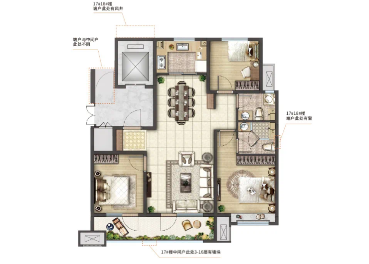 建面约107㎡和建面约119㎡是臻稀的元宝户型,享独立电梯厅,户型布局合理,南北通透。玄关处设有储物空间,方便收纳杂物,餐客一体大通厅外接约10㎡阳台,享受5㎡赠送面积,加满生活的幸福感,购房体验更超值。