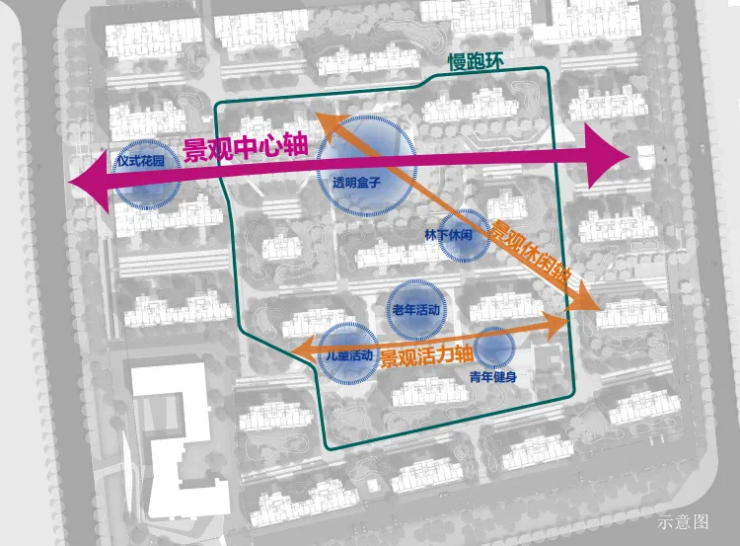 一环是环社区的健康慢跑道,三轴是景观中心轴、景观活力轴、景观休闲轴三条贯穿整个社区的景观轴线,六境是仪式花园、透明盒子、林下休闲、儿童活动、老年运动、青年健身组成的越秀特色社区互动空间,越秀星汇城以公园式自然人文架构,组成更具温度感的公共开放空间。