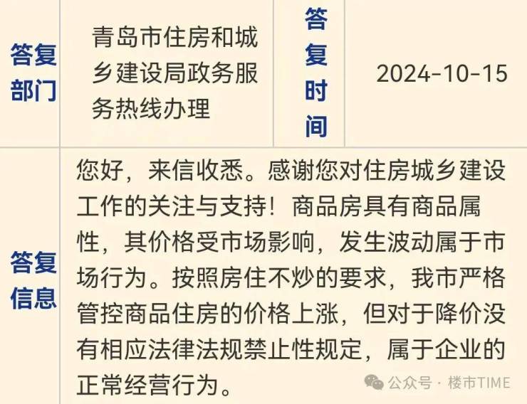 当购房者将希望寄托于青岛官方时,答案却并不令人感到意外。青岛市住房和城乡建设局的官方回复明确表示,商品房的降价属于市场行为,无权干涉。对购房者而言,这无疑是碰了一个“软钉子”。房子作为一种商品,自然会受到市场供求关系的影响。然而,当这种波动直接影响到购房者的切身利益时,官方是否应当介入,成为了一个值得讨论的话题。
