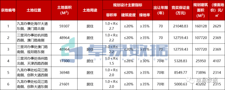 6号地块位于九龙办事处松花江路南侧、创新大道东侧 ,住宅用地,占地面积21601㎡,容积率2.0,规划建面43202㎡,楼板价2315元/㎡,总价1亿。