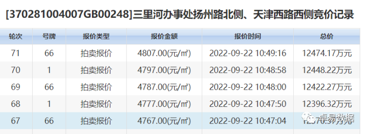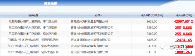 4宗地位于胶州新城区,有1宗被2家竞买人经过71轮争夺;有2宗三里河街道的地块被利群获得,另外2宗开发区地块均被平台公司获得。