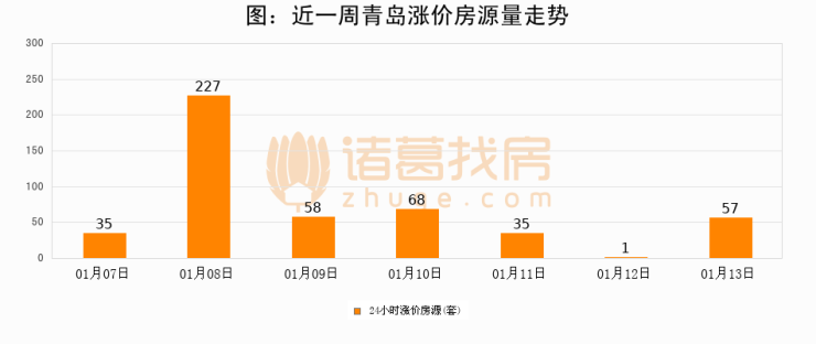 根据诸葛找房数据显示,青岛24小时涨价房源量为57套,较01月12日增加56套,环比上涨5600%。与此同时,涨价房源占比小幅扩大,业主信心有所提升。