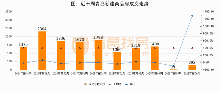 进入2025年第06周(02月03日-02月09日),青岛新建商品房成交292套,较上周增加271套,环比上涨1290.5%