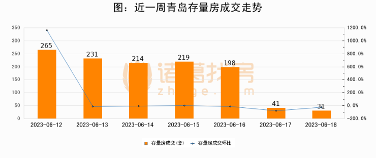 从存量房来看,2023年06月18日青岛存量房单日成交31套,比昨日减少10套,环比下降24.4%。从近一周存量房成交来看,青岛存量房日均成交套数为171套,06月18日单日成交31套,低于近一周平均水平81.9%。