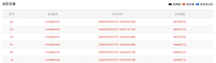 该地块吸引5家竞买人参与,出价记录显示,经过24轮竞价后,湖南嘉颂房地产开发有限公司以最高报价86783万元竞得,折合楼面价7748元/平方米,溢价率22.98%。天眼查APP显示,湖南嘉颂房地产开发有限公司由永州市嘉信房地产开发有限公司100%持股。