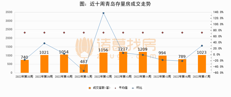 存量房方面,第47周青岛存量房成交1023套,较上周增加234套,环比上涨29.7%。从近十周成交走势来看,周均成交套数为969套,本周高于平均水平5.6%。