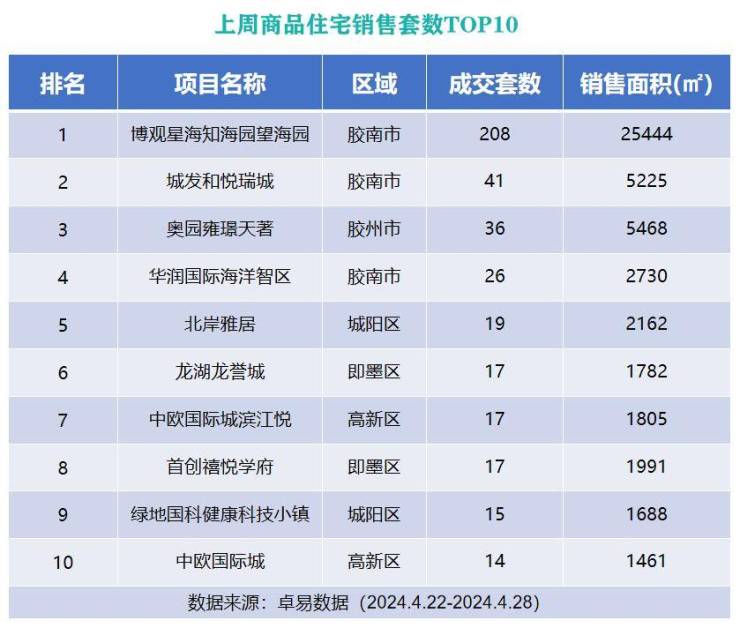 从各项目成交套数来看,位于西海岸新区的博观星海知海园望海园以成交208套的成绩列榜单首位;位于西海岸新区的城发和悦瑞城以成交41套成绩上榜第二位;位于胶州市的奥园雍璟天著以成交36套的成绩列榜单第三位。