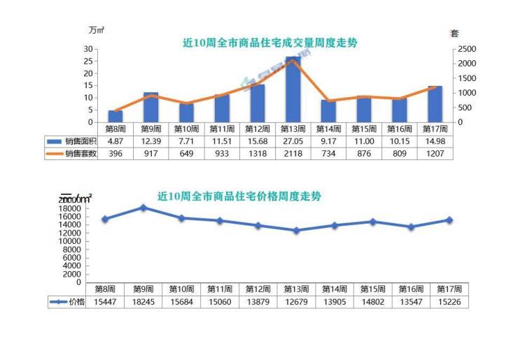价格方面,上周青岛新建商品住宅均价为15226元/㎡,上升1679元,涨幅为12.39%。