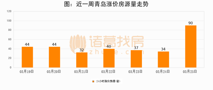 根据诸葛找房数据显示,青岛24小时涨价房源量为90套,较03月24日增加56套,环比上涨164.7%。与此同时,涨价房源占比小幅扩大,业主信心有所提升。