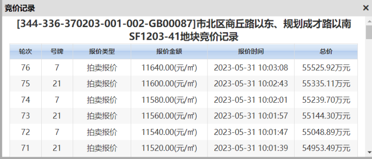 最先出价的是环海湾,海信、保利、青城和招商出价比较积极,最后成了青城和青特&建信2家本土“青”字头的厮杀,青城和环海湾间,青城和招商……,本场出价速度比较快不拖泥带水,大家基本奔着熔断去的。