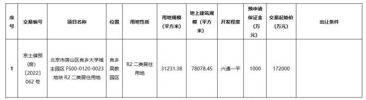 北京市房山区良乡大学城主园区FS00-0120-0023地块R2二类居住用地的土地面积为31231.38平方米,地块用地性质为居住用地,交易起始价17.2亿元。