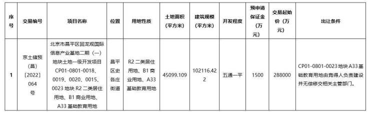 按照地块交易公告,北京市昌平区回龙观国际信息产业基地二期(一)地块土地一级开发项目CP01-0801-0018、0019、0020、0015、0023地块R2二类居住用地、B1商业用地、A33基础教育用地的土地面积约45099.109平方米,该地块的用地性质兼具居住、商业及基础教育用地,地块交易起始价约28.8亿元。
