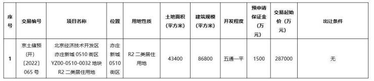 北京经济技术开发区亦庄新城0510街区YZ00-0510-0032地块R2二类居住用地的土地面积约43400平方米,该地块的用地性质为居住用地,交易起始价约28.7亿元。