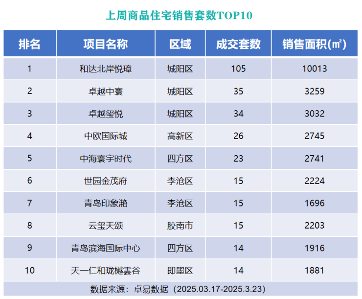 从各项目成交套数来看,位于城阳区的卓越中寰以成交35成绩上榜第二位;位于城阳区的卓越玺悦以成交34套的成绩列榜单第三位。