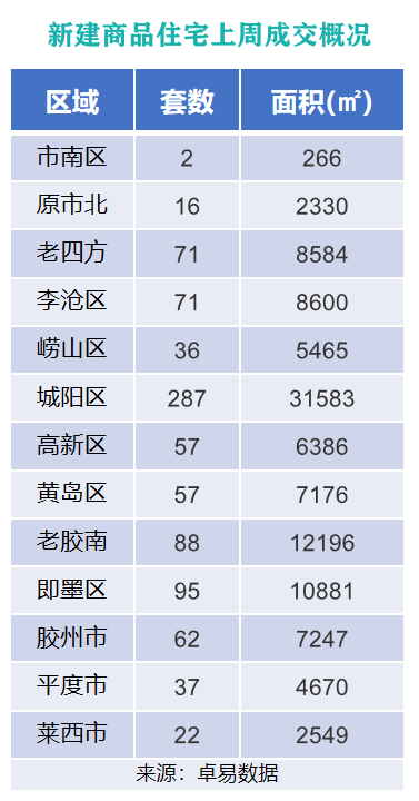 从各区成交情况来看,上周城阳区新建商品住宅以成交面积31583㎡的成绩,位列上周各片区新建商品住宅成交面积榜首位;原胶南市以成交面积12196㎡的成绩,位列成交面积榜第二位;即墨区以成交面积10881㎡的成绩,位列成交面积榜第三位。