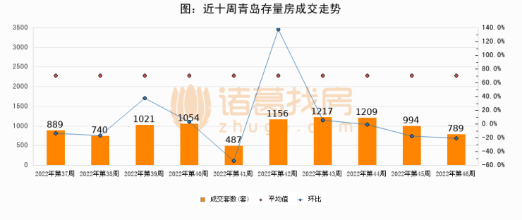 存量房方面,第46周青岛存量房成交789套,较上周减少205套,环比下降20.6%。从近十周成交走势来看,周均成交套数为955套,本周低于平均水平17.4%。