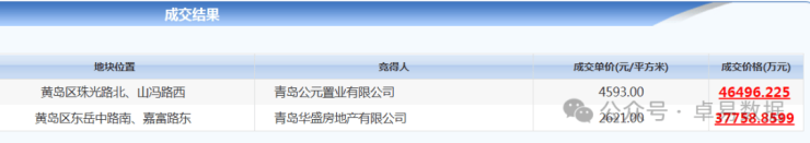 9月15日,青岛公元置业有限公司4.65亿拿下灵山湾北地块;青岛华盛房地产有限公司 (海投)3.77亿拿下西站附近地块,2家均为平台公司。