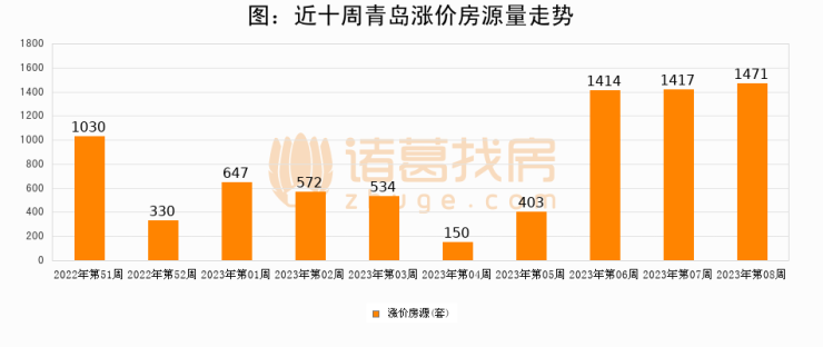 从调价房源来看,第8周青岛涨价房源1471套,较上周上涨3.8%。与此同时,8周涨价房源占比提升0.61个百分点,业主信心持续恢复。