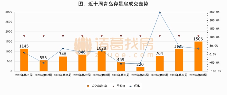 存量房方面,第08周青岛存量房成交1506套,较上周增加381套,环比上涨33.9%。从近十周成交走势来看,周均成交套数为839套,本周高于平均水平79.5%。