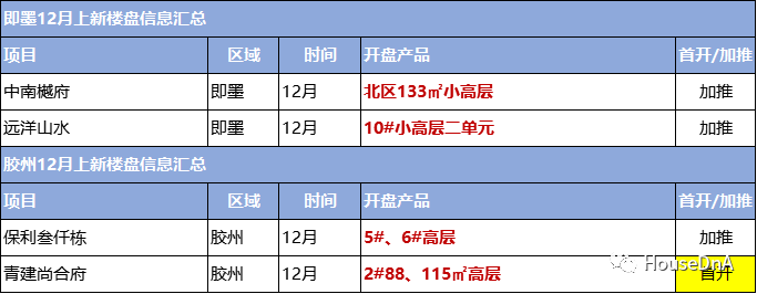 即墨和胶州这对“难兄难弟”,临近年底仍艰难度日,以低价创业绩,12月各有两个项目入市。位于即墨城西的中南樾府销售不俗,目前南区住宅已经售罄,预计年底前推出北区133㎡小高层,预计均价14500元带装修。择址鳌山卫的远洋山水,11月份试水推出了一个单元的单价9字头毛坯小高层,吸引了不少刚需客户出手,预计还将再推另一个单元,造势年底业绩。