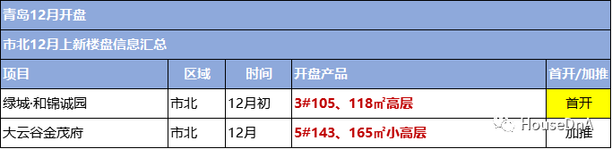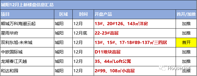 城阳12月六盘计划入市,以加推盘为主,仅有一个纯新盘位于白云山板块的双利东旭未来城,计划首开四栋住宅,89-137㎡三居四居,目前已经在意向登记。加推的项目里,白云山板块的和达和园12月加推99㎡和108㎡小高层,近邻白沙河的万科热盘海潮云起计划加推126和143㎡的洋房,预计22000-26000元/㎡,开启认筹。近邻地铁七号线的龙湖春江天越计划推出35、44㎡Loft公寓。另外,高新区紧靠青岛中学的星雨华府前期房源已经售罄,预计12月底将推出两栋高层,预计在12000-13000元,正在验资中。金茂老盘中欧国际城计划再推D11地块,首开高层住宅。
