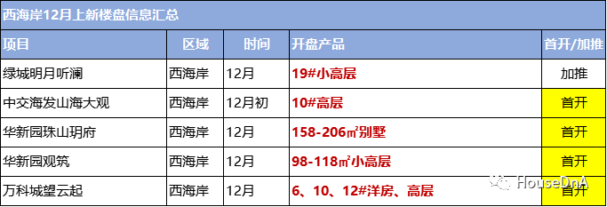12月份西海岸将有五盘上新,其中新盘四个,少有加推位于灵山湾板块的绿城明月听澜,是绿城落子西海岸排名前列作品,目前在售多个小高层楼座,均价在11000元,年底还将推出89㎡三居,主打刚需购房者。新盘之中,华新园两大项目入市时间推迟多时,观筑主打98-118㎡小高层、珠山玥府规划158-206㎡别墅;另外,中交海发山海大观计划月初首开一栋高层。位于老胶南的万科城望云起是海岸万科城的三期住宅,规划洋房和高层,预计首开三栋产品,建面87、107、115、125㎡。