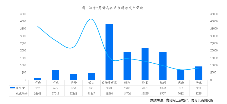 分区域看,5月西海岸新区新房成交3821套,即墨区新房成交2171套,反超城阳区居5月区域成交第二位;城阳区新房成交1908套,居区域成交第三。