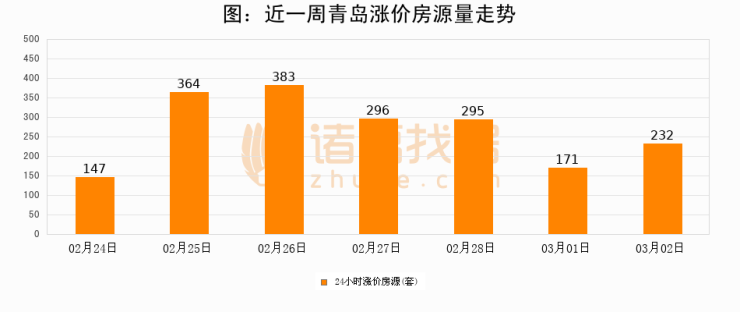 根据诸葛找房数据显示,青岛24小时涨价房源量为232套,较03月01日增加61套,环比上涨35.7%。与此同时,涨价房源占比小幅扩大,业主信心有所提升。