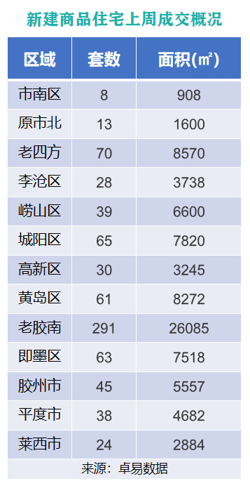 从各区成交情况来看,上周原胶南市新建商品住宅以成交面积26085㎡的成绩,位列上周各片区新建商品住宅成交面积榜首位;原四方区以成交面积8570㎡的成绩,位列成交面积榜第二位;原黄岛区以成交面积8272㎡的成绩,位列成交面积榜第三位。